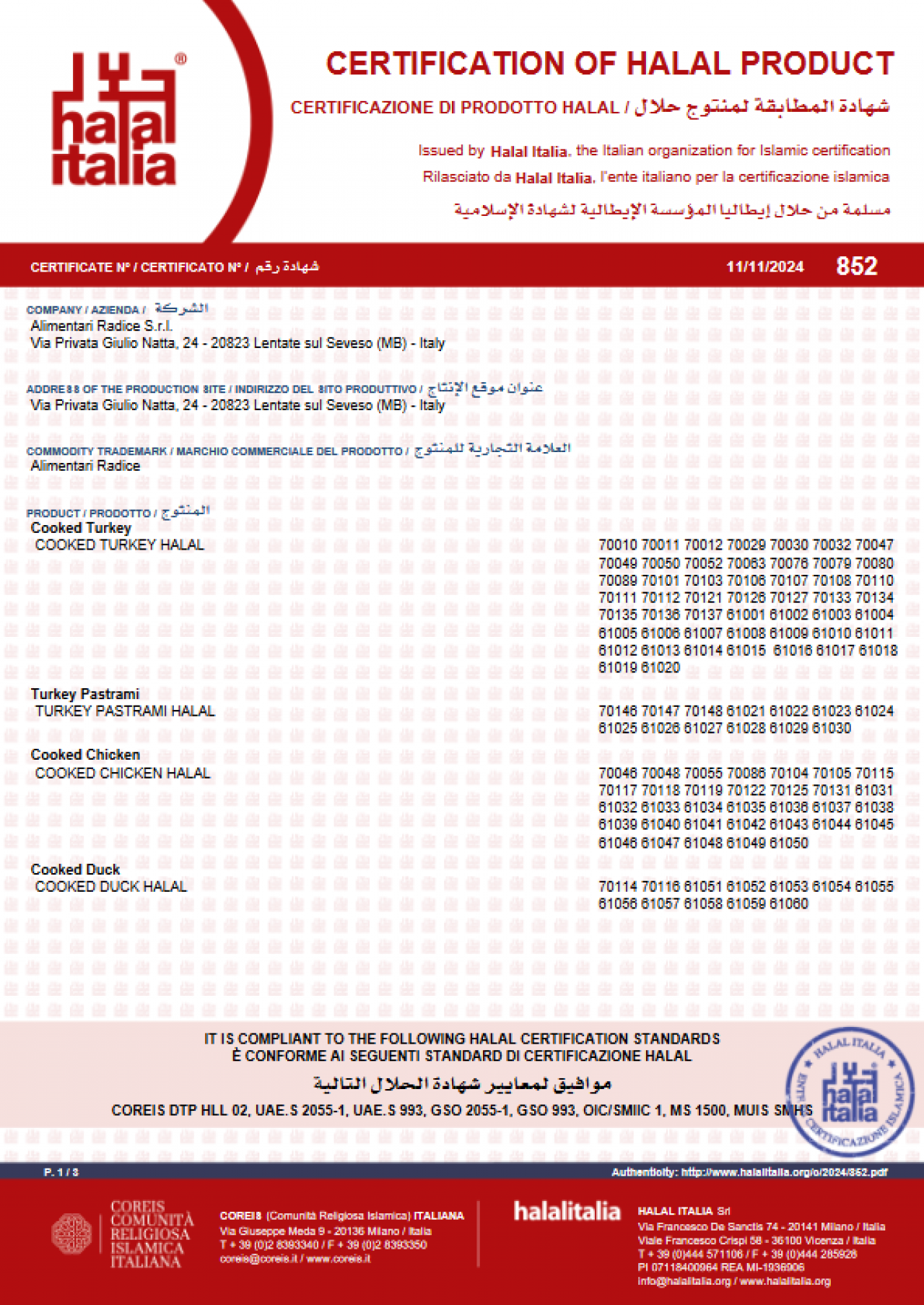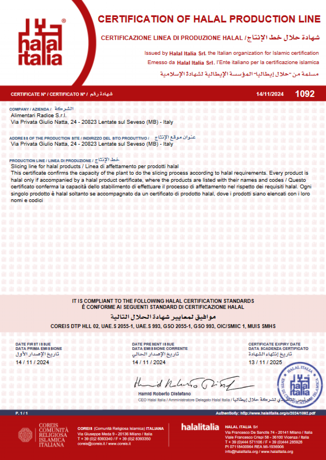Certificazione di prodotto che garantisce la conformità agli standard per la certificazione di prodotto halal dei prodotti alimentari della CO.RE.IS. (comunità religiosa islamica) italiana. Tale certificazione è valida solamente per le referenze della divisione Specialità.
