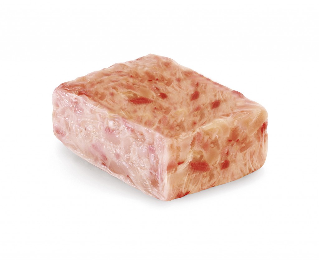 nervetti e testine di vitello toelettati, tagliati, lasciati macerare con la salamoia, cotti a bagnomaria, immersi con la gelatina in uno stampo, raffreddati, confezionati sottovuoto in condizioni controllate, pastorizzati e nuovamente raffreddati