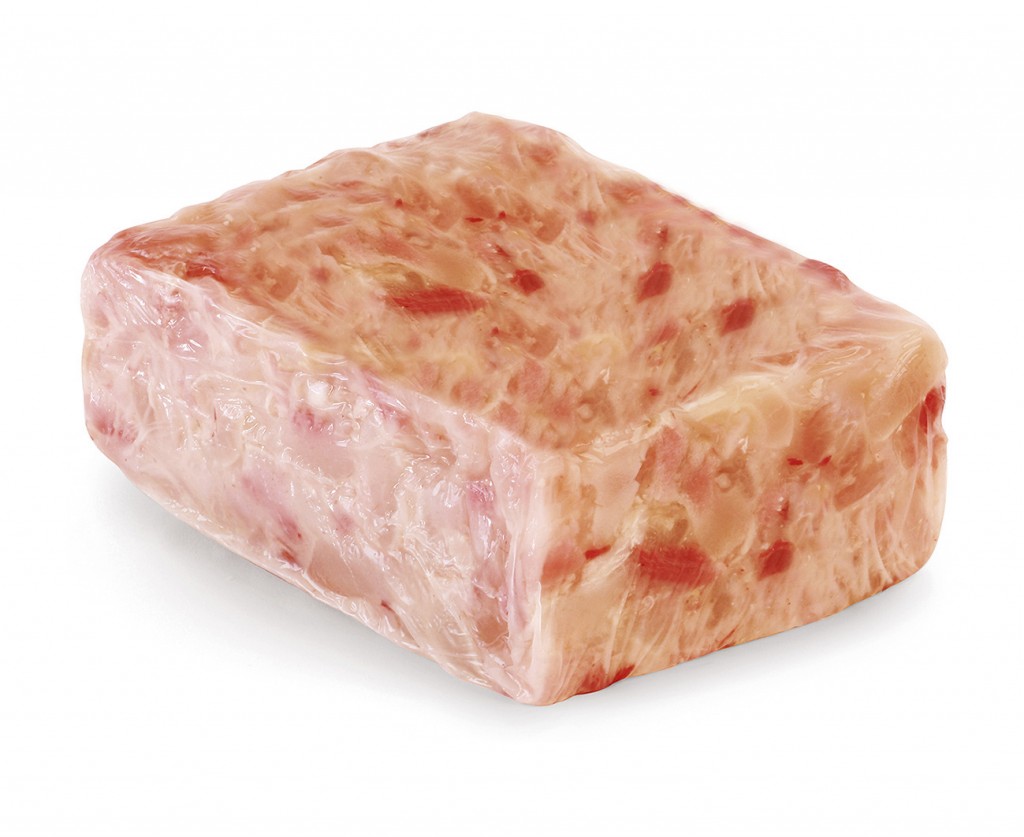 nervetti e testine di vitello toelettati, tagliati, lasciati macerare con la salamoia, cotti a bagnomaria, immersi con la gelatina in uno stampo, raffreddati, confezionati sottovuoto in condizioni controllate, pastorizzati e nuovamente raffreddati
