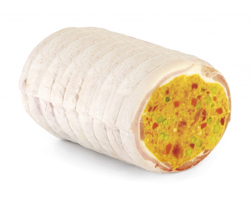 specialità a base di pancetta di suino ripiena di una farcitura composta da uova, pollo, piselli e carote arrotolata, formata in stampo ovale tipo rollè, cotta a vapore, raffreddata, confezionata sottovuoto in condizioni controllate, pastorizzata e nuovamente raffreddata